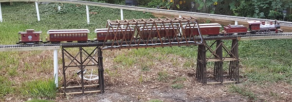 Our garden scale "empire" began on the pool deck of our old house. That was back in 2013. Ann found a train set advertised in a local "trader" type publication for $50. It was an older Bachmann "Big Haulers" starter set, the "Royal Blue", a B&O passenger train. It included the "ten wheeler" engine, tender, two passenger cars, a bunch of indoor track, and the power pack. Everything looked to be in good shape, so we said why not?